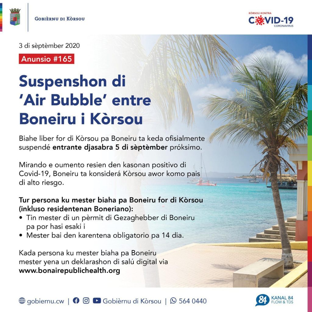 3 di sèptèmber 2020 – Suspenshon di Air Bubble entre Boneiru i Kòrsou