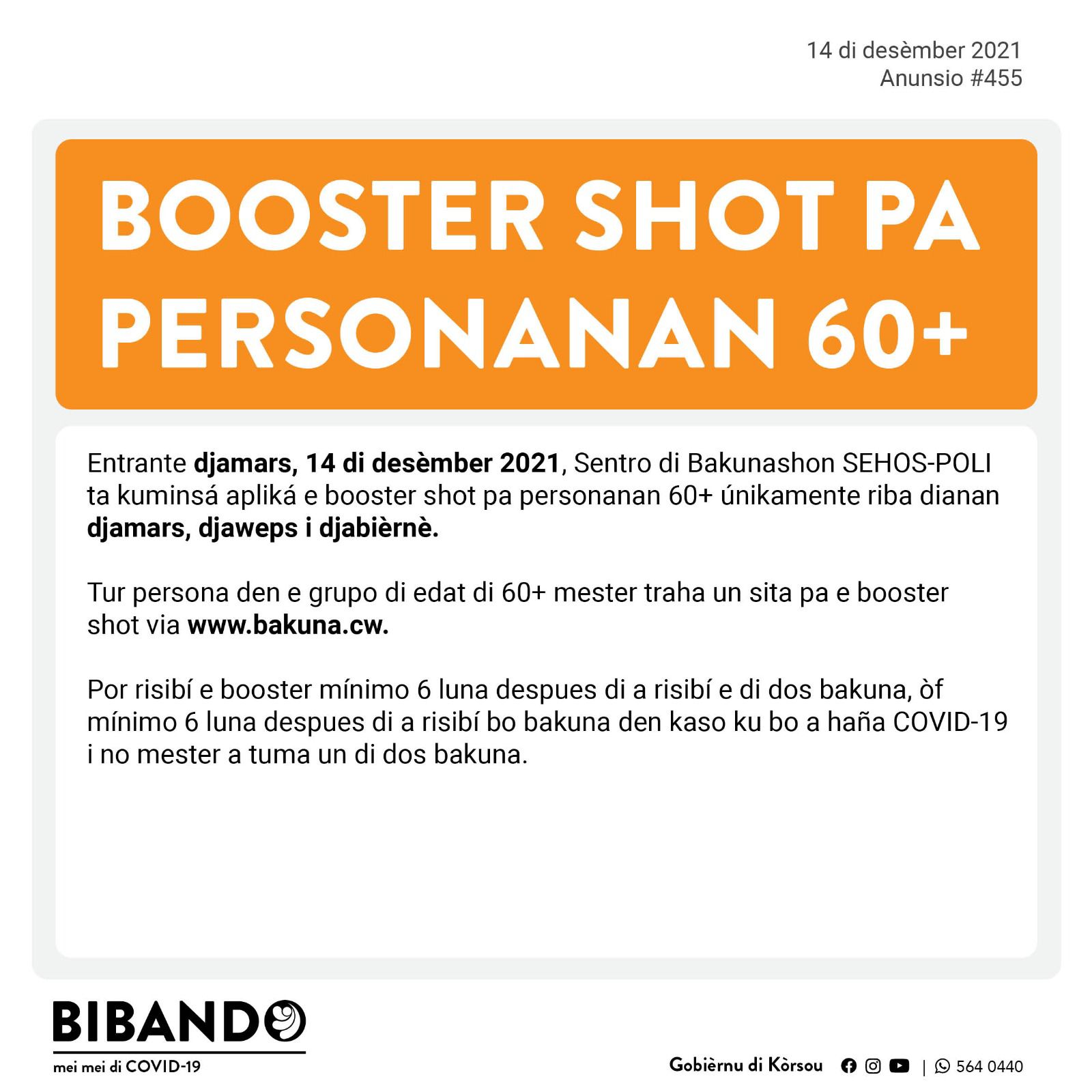 Djamars 14 di desèmber 2021 – Booster shot pa personanan 60+