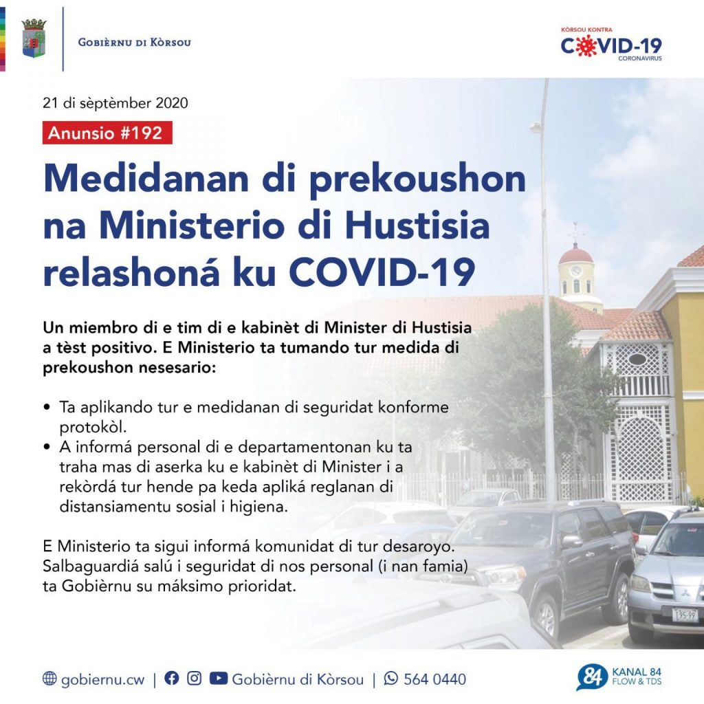 21 di sèptèmber 2020 – Medidanan di prekoushon na Ministerio di Hustisia relashoná ku COVID-19