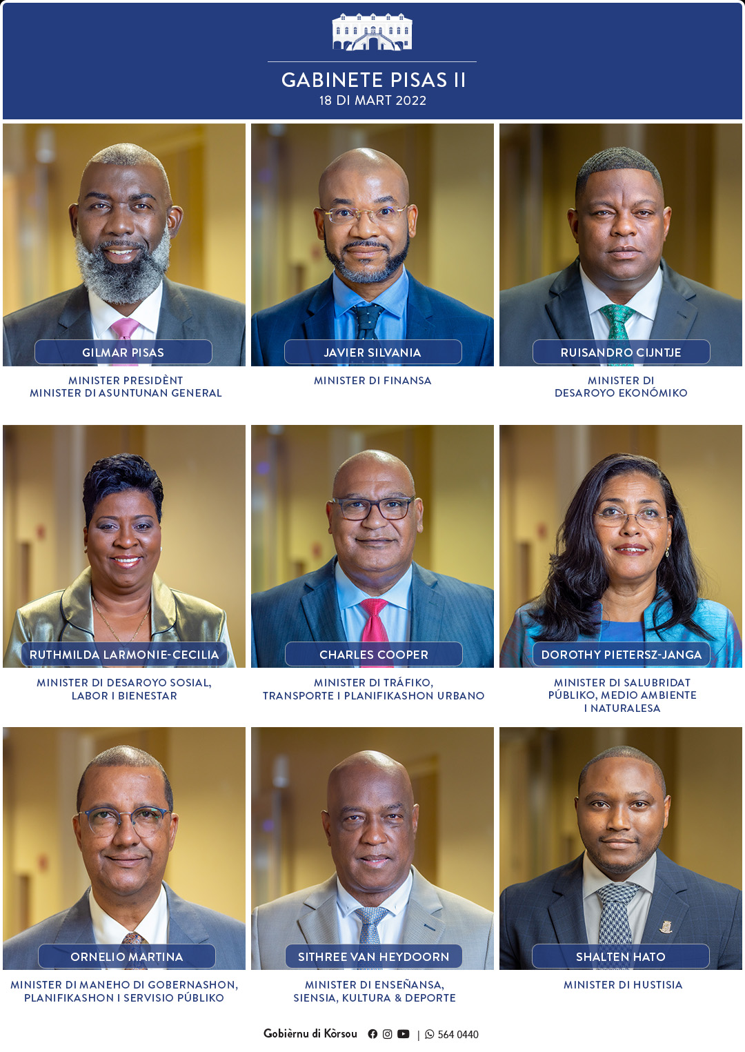 [TUMA NOTA]: Djabièrnè 18 di mart 2022, sr. Shalten Hato a keda huramentá komo Minister di Hustisia pa Gabinete Pisas II. Ku e huramentashon di sr. Hato, Gabinete Pisas II awor ta kompletu kontando ku un minister pa kada 9 ministerio di Gobièrnu di Kòrsou.