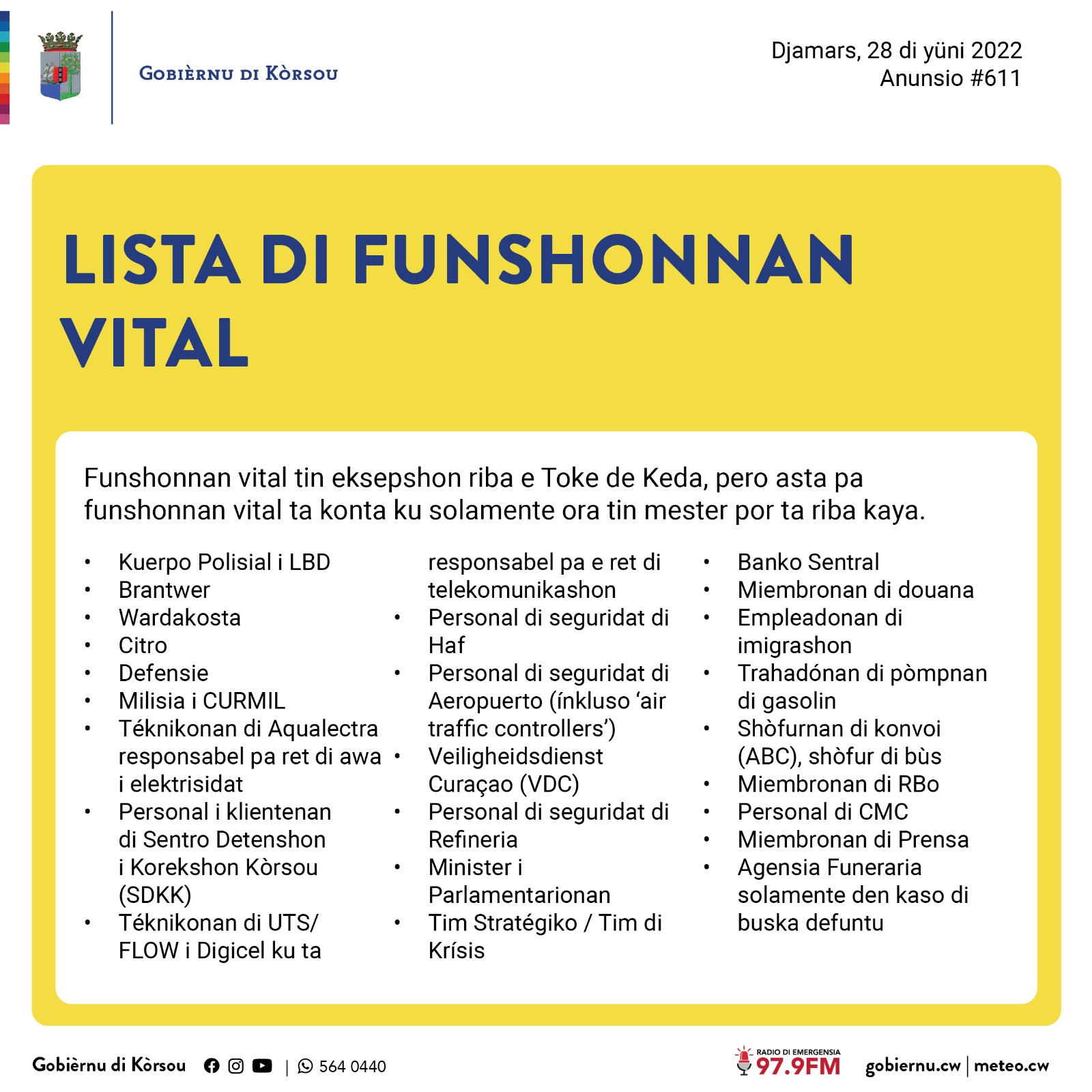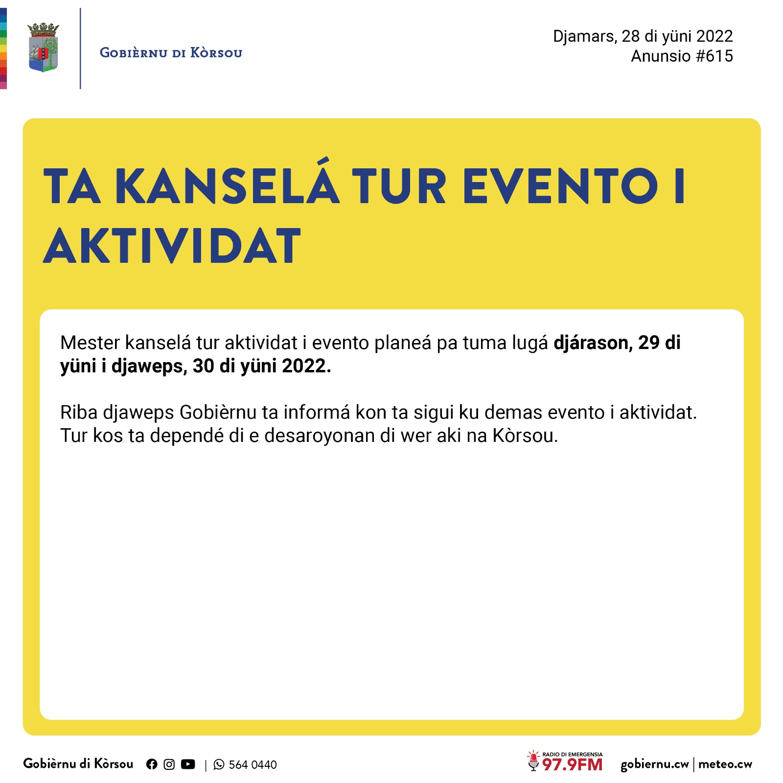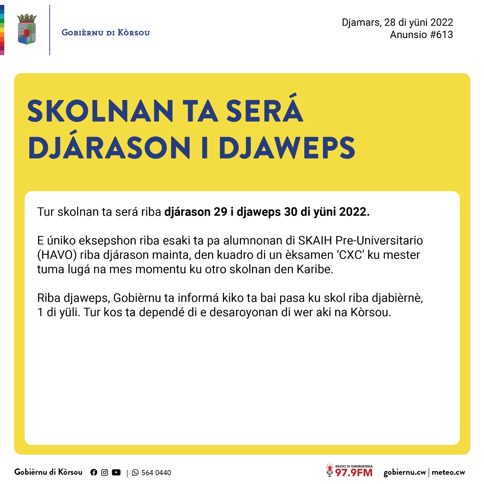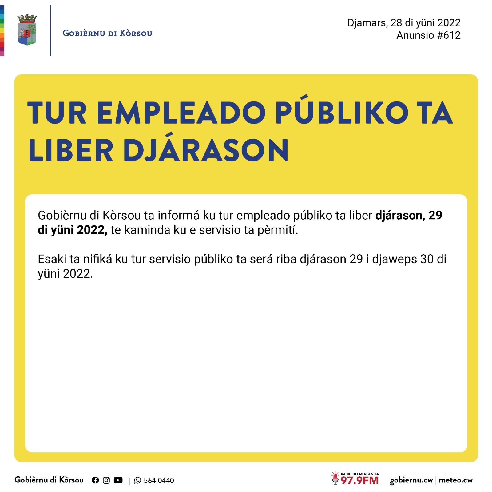 Sigui kanalnan ofisial di Gobièrnu di Kòrsou òf bo media preferí pa un siguiente ‘update’: djárason 29 di yüni 2022 pa 11:30’or di mainta.