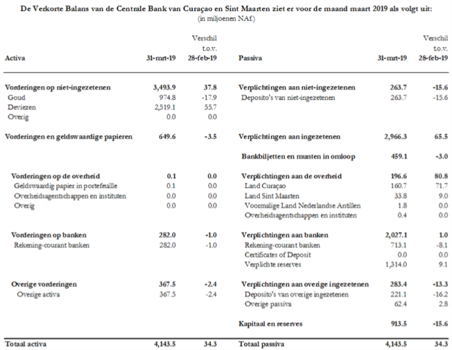 Tenslotte is de post “Goud” aan de activazijde van de balans met NAf.31,3 miljoen gestegen door de hogere marktwaarde op de balansdatum vergeleken met eind december 2018. De stijging van de post “Kapitaal en reserves” aan de passivazijde van de balans was gerelateerd aan de toename van de marktwaarde van goud.