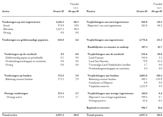De Verkorte Balans van de Centrale Bank van Curaçao en Sint Maarten ziet er voor de maand mei 2019 als volgt uit: