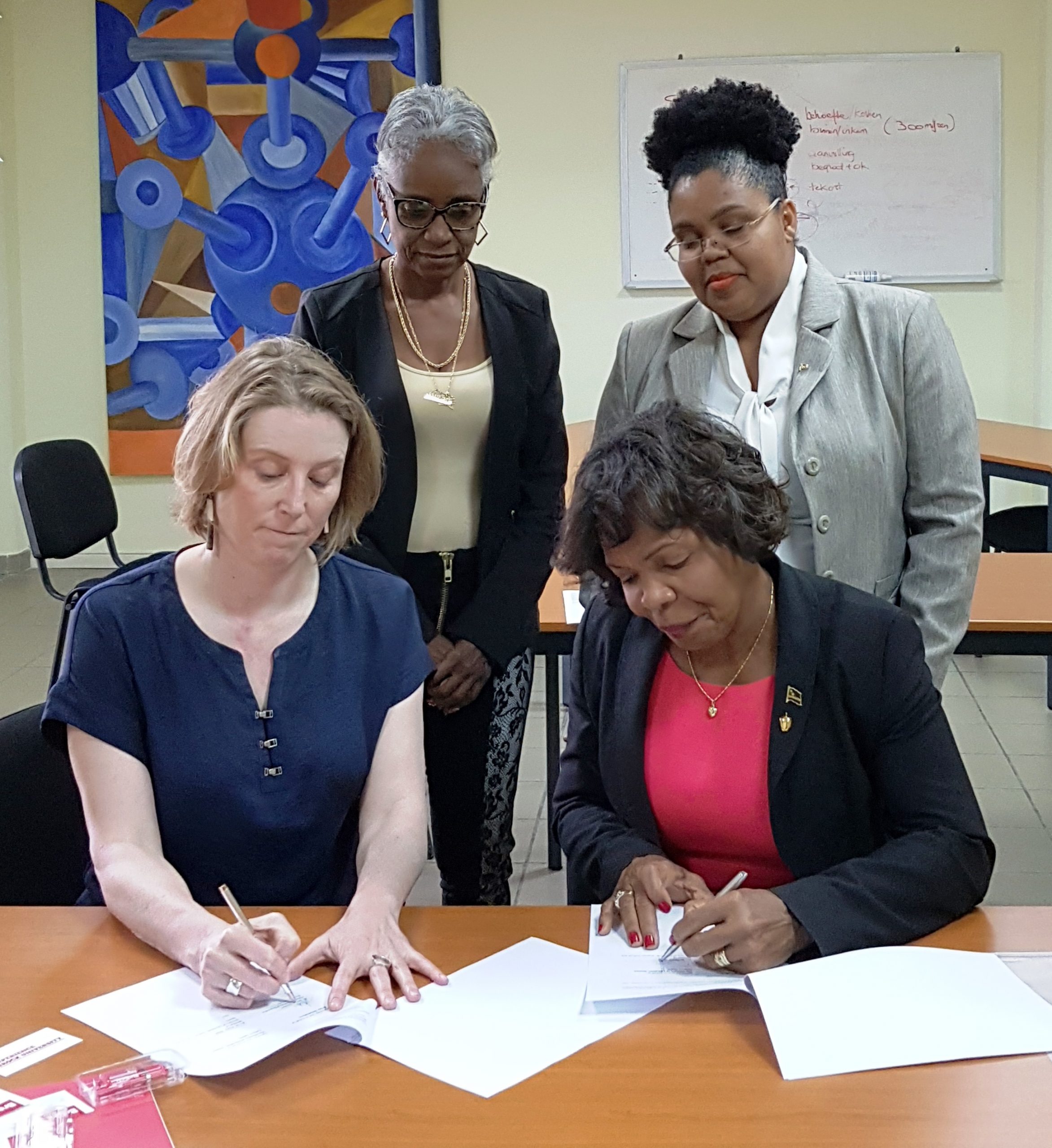 Riba potrèt por mira e momento ku ta firma e MOU ku representante di Brock University, sra. direktor, L. Keating, sra. direktor di maneho di Ministerio ESKD, S. Larmonie i konsehero finansiero di Ministerio di ESKD, sra. R. Reyna i Minister M. Alcalá-Wallé.