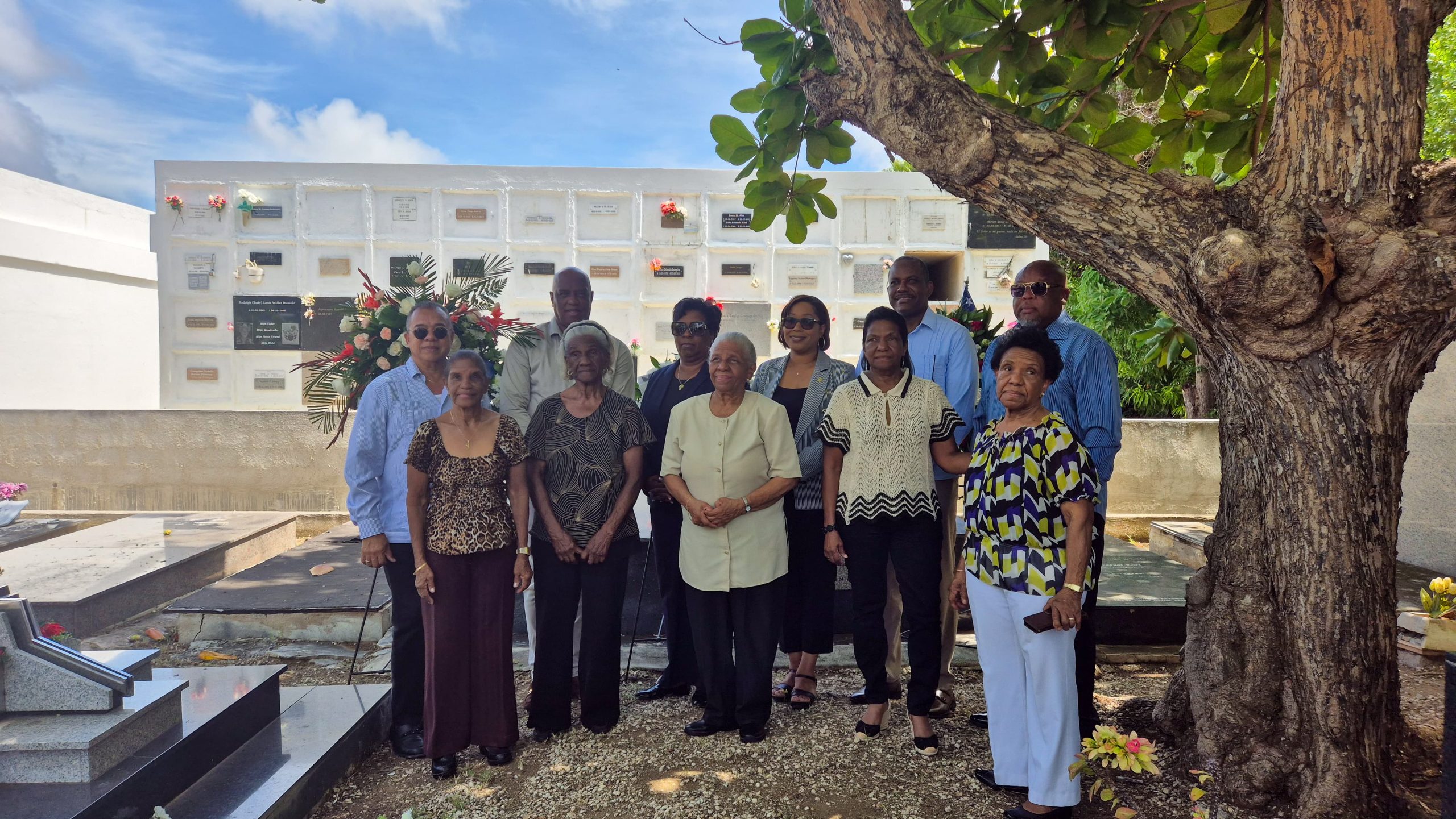Minister di ESKD sr. Sithree van Heydoorn kompaña pa direktor di sektor di Kultura i Deporte sra. Lizette Sambo-Velder, Presidente di Parlamento sra. Charetti America-Francisca kompaña pa Grefir sr. Silvin Cijntje i famianan a pone un bunita krans na graf di sr. Modesto (Chano) Margaetha. Na mes momentu sektor di Kultura i Deporte a informá ku awe ta e inisio di un kantidat di aktividat na honor di nos lenga materno ku ta sigui durante di e periodo di 8 febrüari pa 21 febrüari 2025. Pero e aktividatnan aki, ku ta kulminá dia 21 febrüari 2025, ku ta dia Internashonal di Idioma Materno, ta keda publiká den un otro komunikado ku mas informashon.