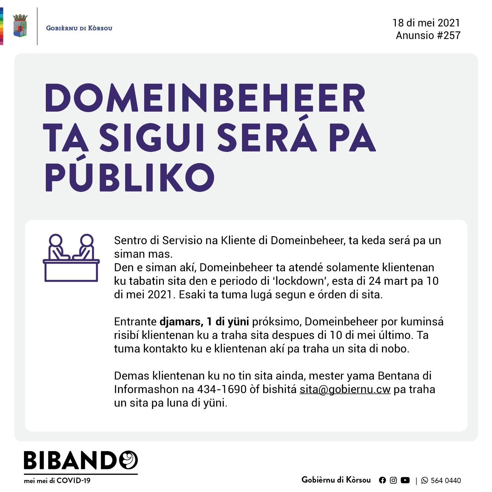 WILLEMSTAD – Domeinbeheer ta informá ku nan ‘Sentro di Servisio na Kliente’ lo keda será pa un siman mas. Lo atendé solamente klientenan ku tabatin sita den e periodo di ‘lockdown’, esta di 24 mart pa 10 di mei 2021. Esaki lo tuma lugá segun e órden di sita.
