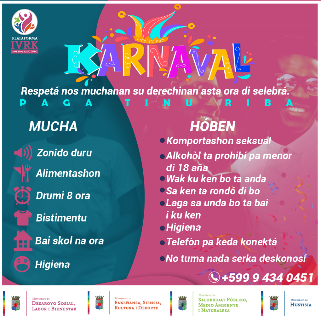 Ministerio di Salú, Medio Ambiente i Naturalesa ta hasi un yamada na instanshanan, asosiashon di bario/ bisiña riba ruta di Karnaval pa den kaso ku bo sa di un lugá pa yama 432- 2867 i informá nos pa asina un i tur por disfrutá di nos fiesta kultural.