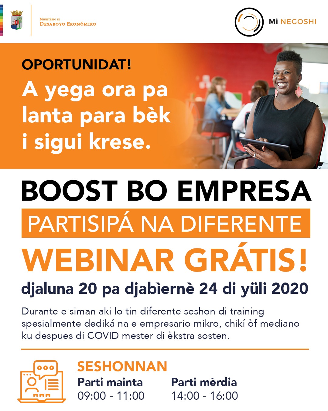 Ministerio di Desaroyo Ekonómiko i Mi Negoshi ta brinda oportunidat na tur empresario pa “boost” bo empresa. Di djaluna 22 di yüli pa djabièrnè 24 di yüli bo por partisipá na diferente seshon virtual dediká na empresario mikro, chikí òf mediano ku despues di COVID-19 mester di èkstra atenshon. Tur dia lo tin un seshon parti mainta i un seshon parti mèrdia.