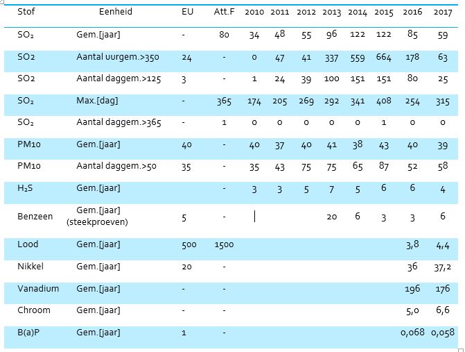 Tur tres stashon ta midi Zwavel (SO2) i partíkula/ stòf fini (TSP i PM10). E stashon na Kas Chikitu ta di sumo importansha komo esaki ta den bario i p’esei ta midi mas komponente manera H2S (Sulfuro di Hidrógeno) i metal. Lokual ta importante di e resultadonan di 2017 ta ku por mira for di resultadonan na Kas Chikitu i Julianadorp ku kompanianan den schottegat huntu no a surpasá e máksimo permití di 80 μg (mikrogram) di SO2 preskribí den Attachment F. Den e gráfiko por mira tambe ku no tabatin dianan ku a midi mas ku 365 μg di SO2. Otro parameter signifikante ta PM10 kual ta partíkulanan mas chikitu ku 10 μm (mikrometer) ku por keda inhalá. Riba e gráfiko por mira ku na Kas Chikitu a midi un promedio di 39 μg den 2017 kual ta mas abou ku e norma Europeo di 40 μg. Nos por mira sí ku en total 58 dia a midi mas ku 50 μg kual a surpasá e norma Europeo di 35 dia. Pero esaki no nesesariamente ta relashoná ku e área industrial pasobra ta nèt e dianan ku tabatin manifestashon di santu di Sahara nos por a mira sifranan haltu di PM10. P’esei por mira tambe ku na Julianadorp a registrá 22 dia ku a midi mas ku 50 μg PM10.