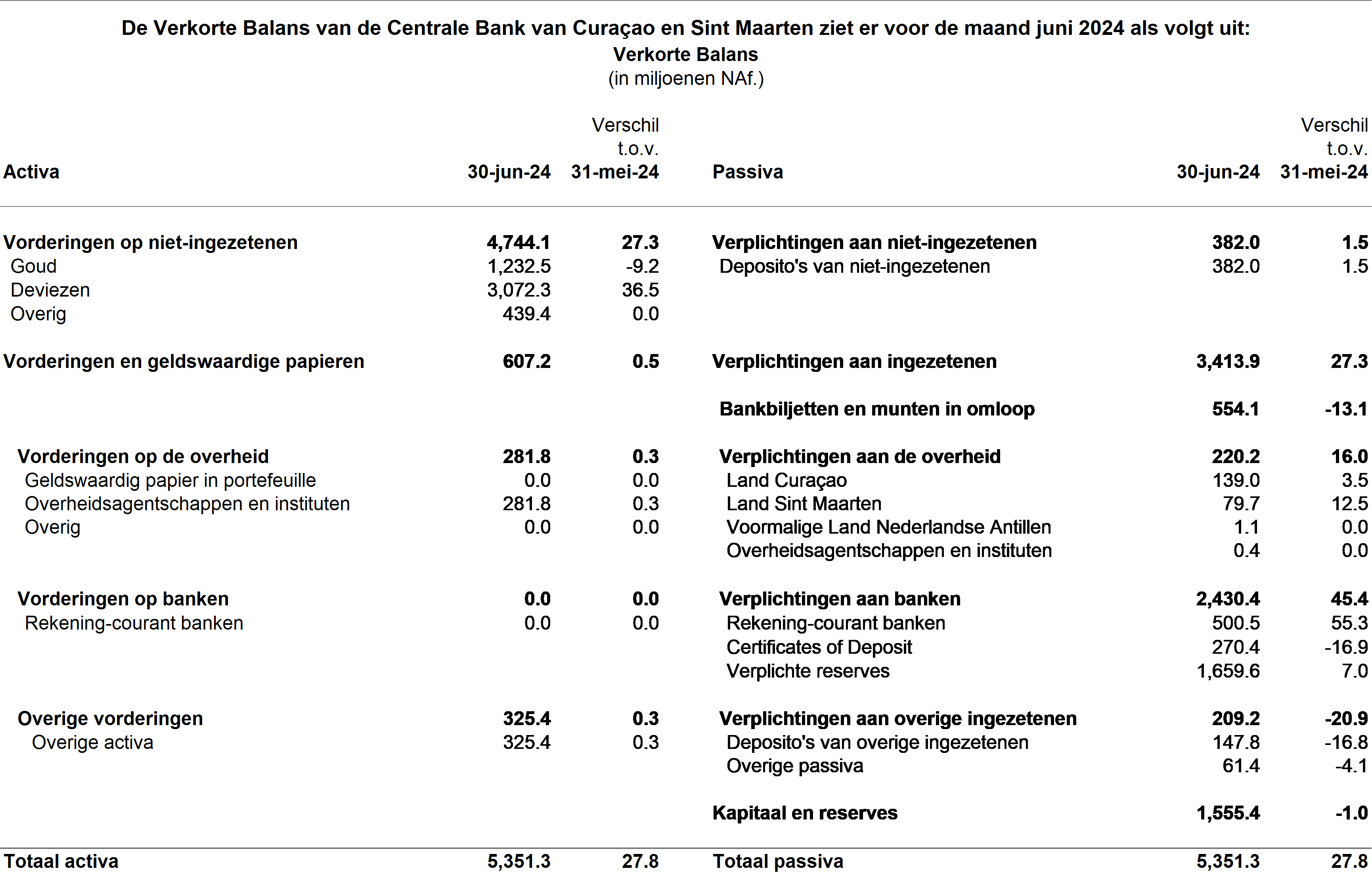 In de maand juni 2024 heeft de Bank het percentage van de verplichte reserve op 19,00% gehandhaafd. Niettemin nam het bedrag van de verplichte reserves met NAf.7,0 miljoen toe door een stijging van de basis waarover deze wordt berekend.[1] Het bedrag aan uitstaande Certificates of Deposit (CD’s) nam met NAf.16,9 miljoen af doordat de commerciële banken voor een lager bedrag hadden ingeschreven op de tweewekelijkse veilingen waar CD’s met looptijden van drie, zes en twaalf maanden worden aangeboden.
