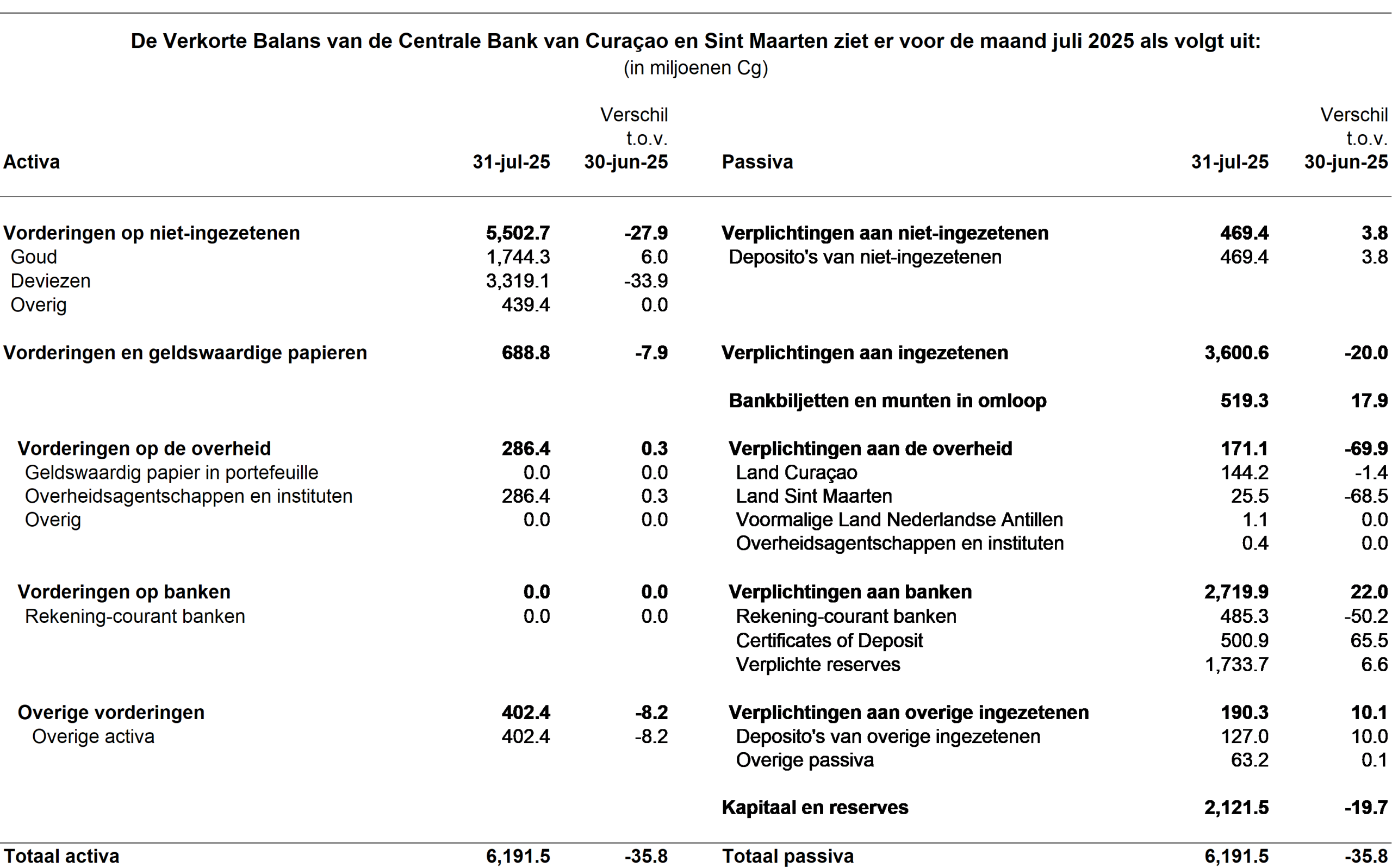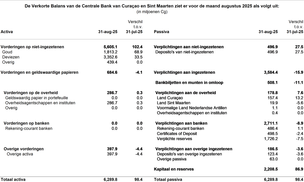 Tenslotte steeg de post “Goud” aan de activazijde van de balans met Cg 68,9 miljoen door een hogere marktwaarde op de balansdatum vergeleken met eind juli 2025. De stijging van de goudprijs kwam vooral door een toegenomen vraag naar goud als “veilige haven” als gevolg van verhoogde geopolitieke en economische onzekerheid, evenals van de verwachte renteverlagingen door de Federal Reserve (Fed), zorgen over de onafhankelijkheid van de Fed en een zwakkere Amerikaanse dollar. De stijging van de post “Kapitaal en reserves” aan de passivazijde van de balans was onder andere gerelateerd aan de hogere waarde van goud.