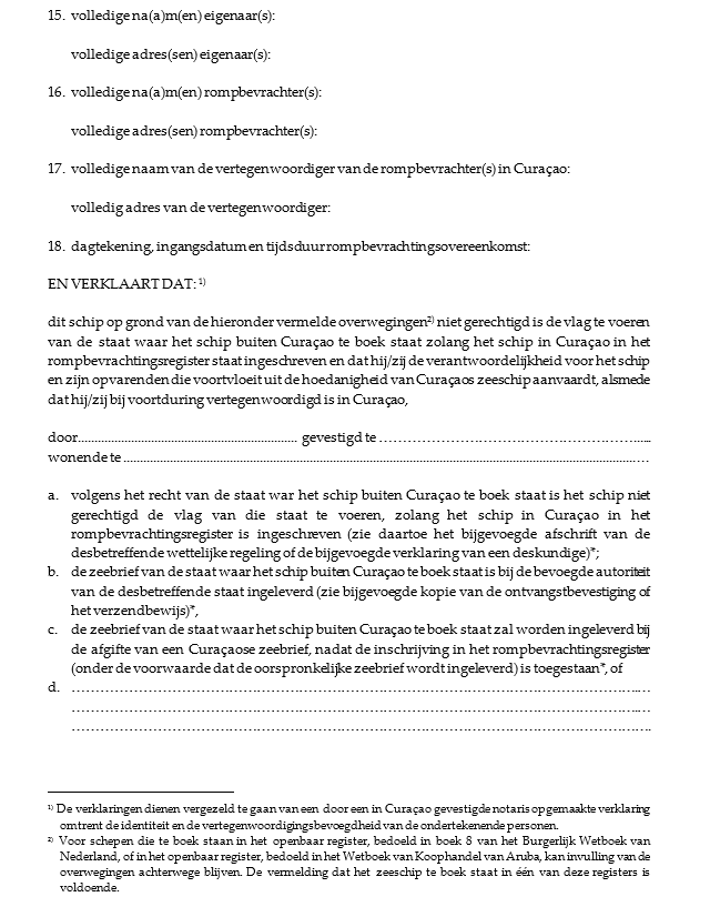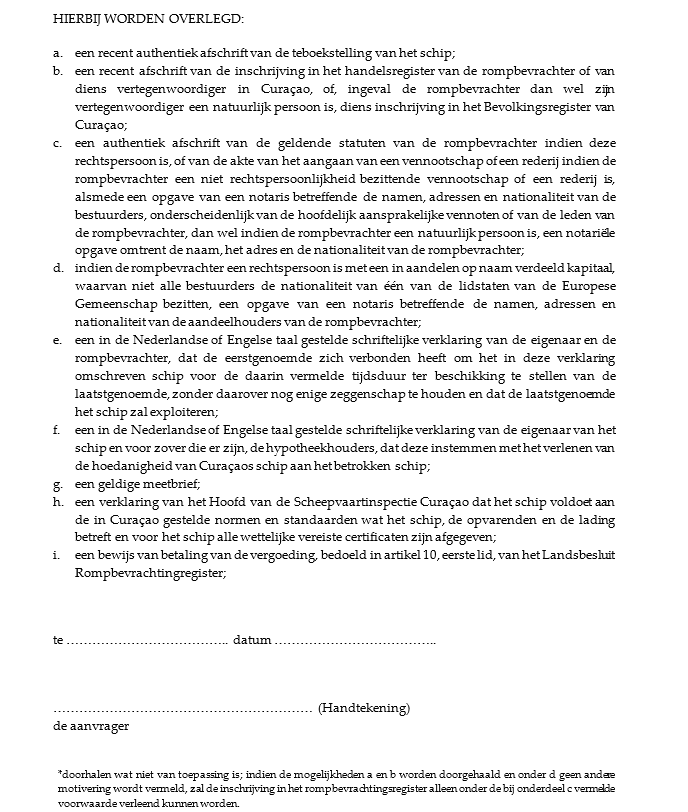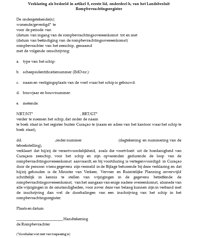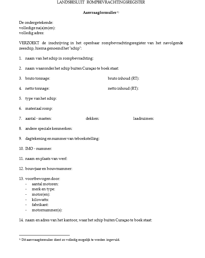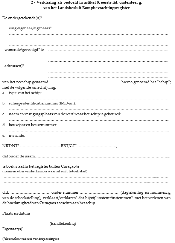 De modellen of formulieren ten aanzien van het verzoek of de verklaringen, bedoeld in artikel 8, eerste lid, onderdelen a, g en h, van het Landsbesluit Rompbevrachtingsregister welke als bijlagen bij deze regeling zijn gevoegd, worden goedgekeurd en vastgesteld.
