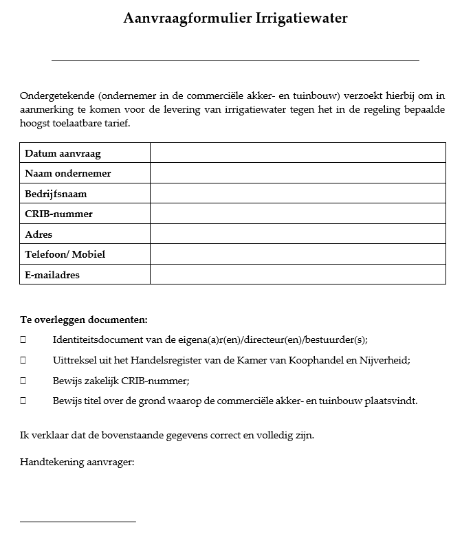 - Irrigatiewater wordt uitsluitend door de ondernemer aangewend en verbruikt voor commerciële akker- en tuinbouw doeleinden en wordt op geen enigerlei wijze aan derden beschikbaar gesteld, verkocht, afgestaan dan wel door derden verbruikt.