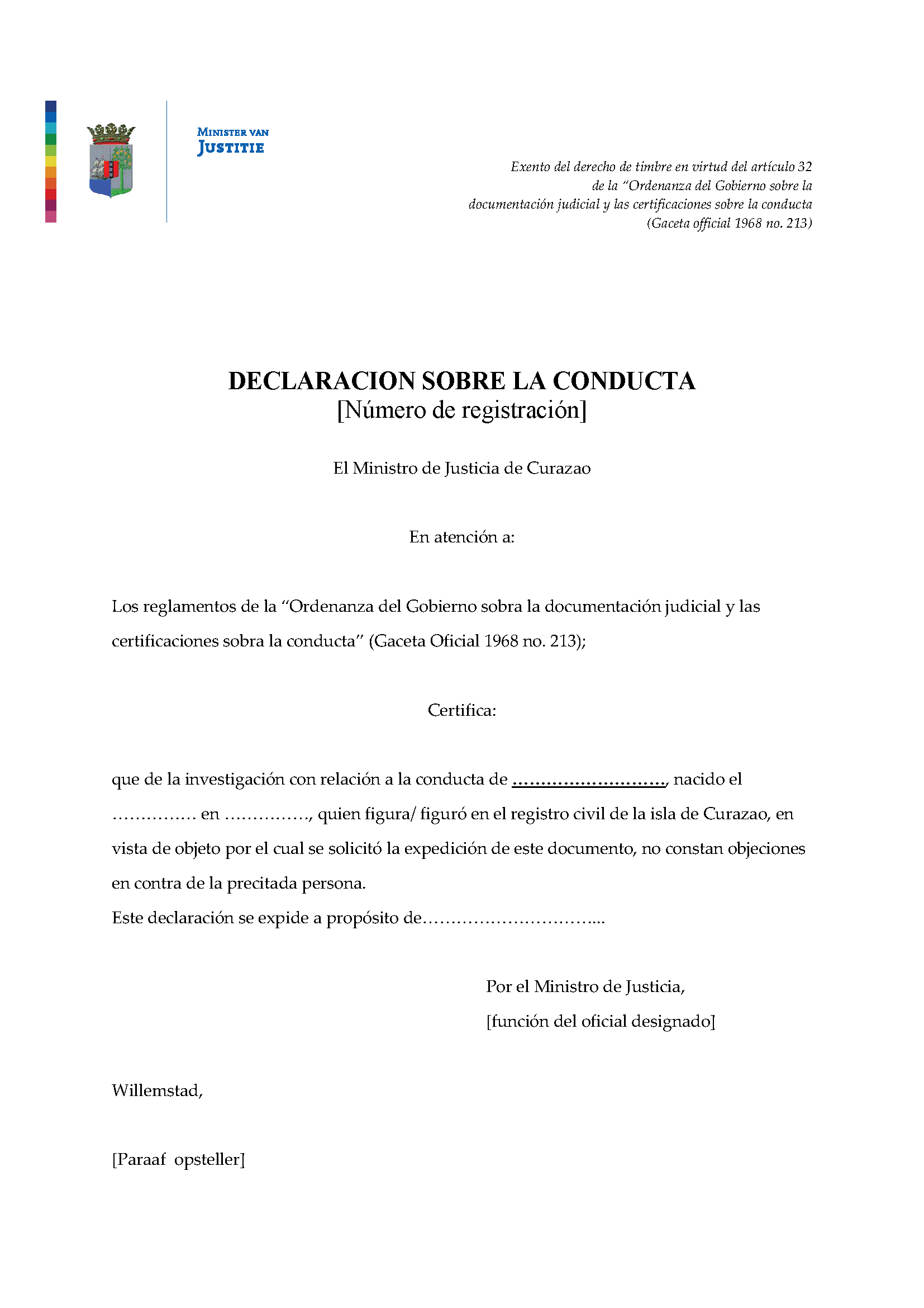 De tekst en het model van de verklaring omtrent het gedrag worden vastgesteld als aangegeven in de bijlagen I, II, en III, respectievelijk in de Nederlandse, de Engelse en de Spaanse taal.