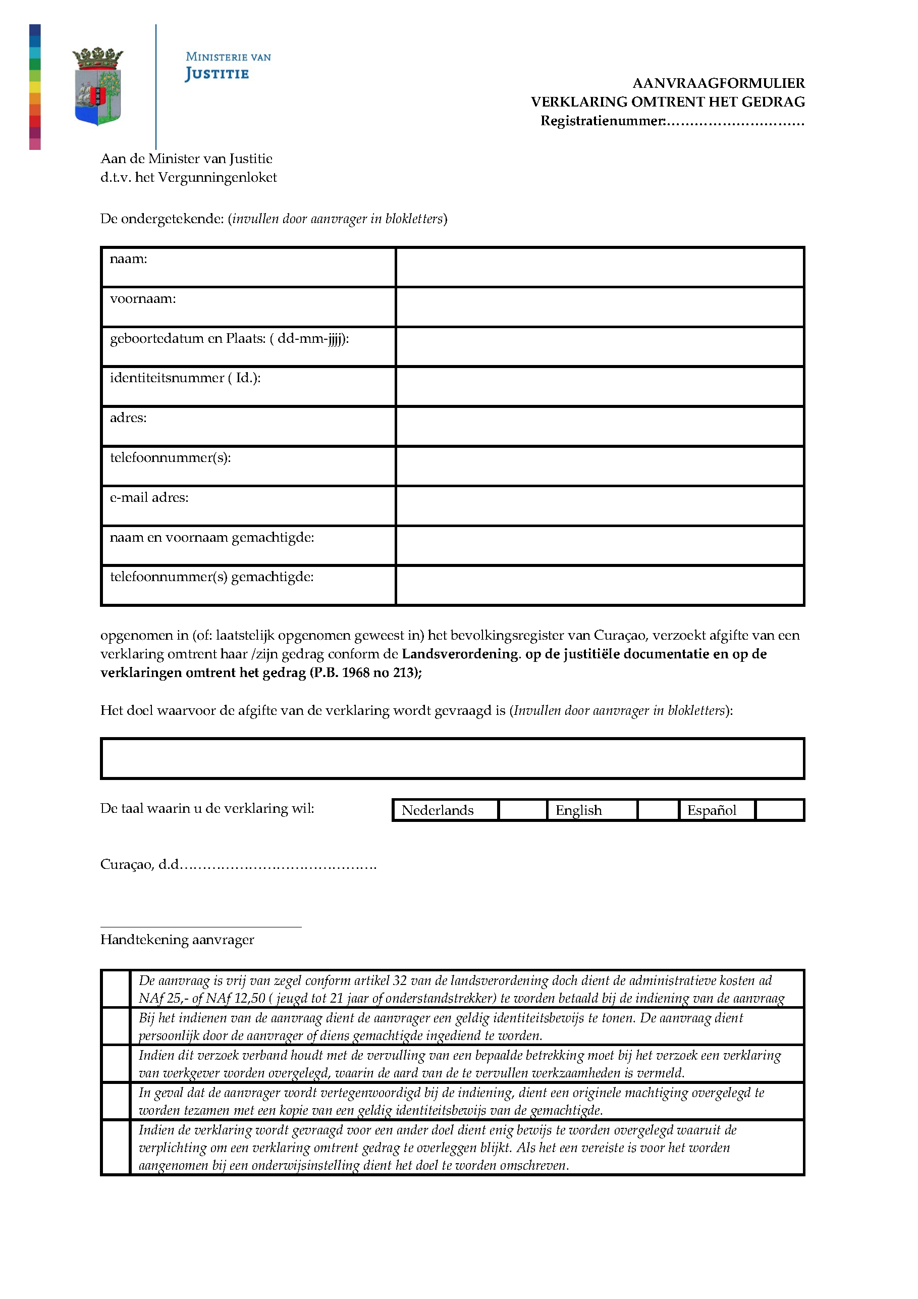 Het formulier, houdende het verzoek tot afgifte van een verklaring omtrent het gedrag, wordt vastgesteld als aangegeven in bijlage IV. Dit formulier kan digitaal ter beschikking worden gesteld aan het publiek en digitaal worden ingediend mits het formulier de handtekening van de aanvrager draagt.