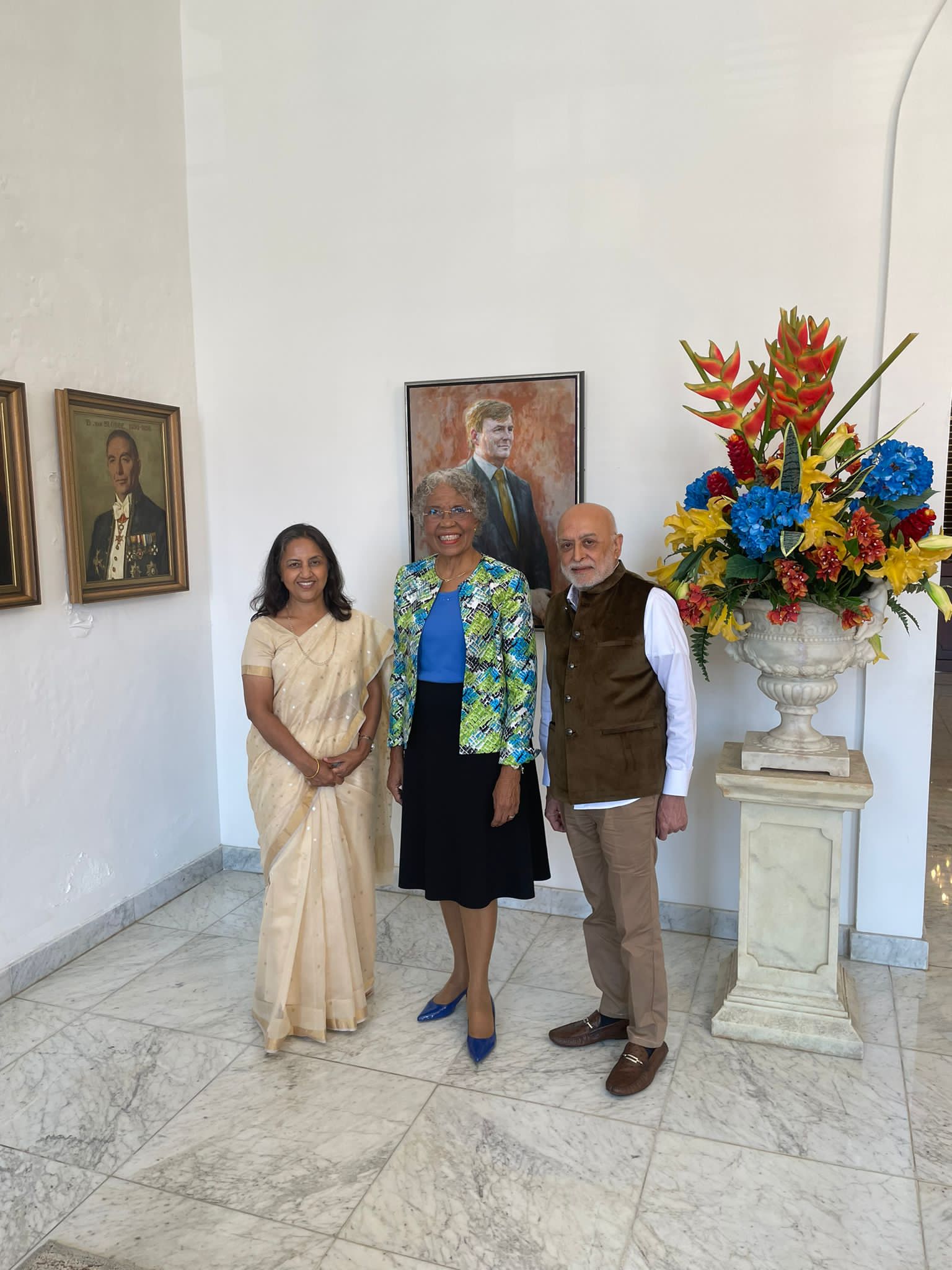 Mevr. Reenat Sandhu, de Gouverneur van Curaçao, H.E. Lucille George-Wout en dhr. Manu Sawilani.