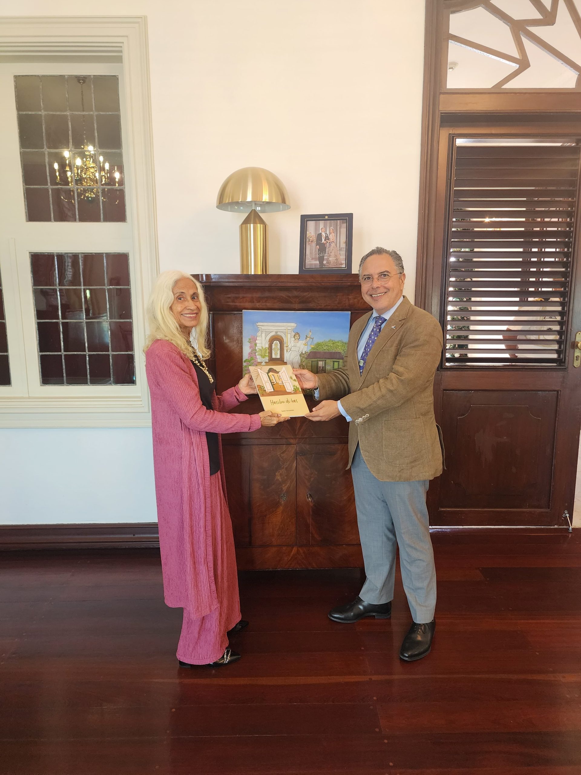 WILLEMSTAD – Op woensdag 10 december 2025 heeft mevr. Saida Hernandez schrijver van het boek “ Hasibu di kas” een bezoek gebracht aan de Gouverneur van Curaçao, Z.E. Mauritsz de Kort. Mevr. Hernandez werd vergezeld door de directie van de Stichting Exploitatie Bloemhof, mevr. Nicole Henriquez en mevr. Michele Russel-Capriles. Tijdens het bezoek heeft mevr Saida Hernandez een exemplaar van het boek overhandigd en uitleg gegeven aan haar kunstwerk genaamd “Hustisia” dat eerder aan de Gouverneur was overhandigd.