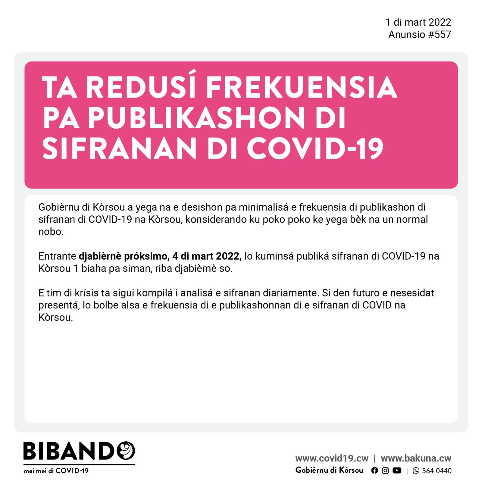 Gobièrnu di Kòrsou ta redusí frekuensia pa publikashon di sifranan di COVID-19