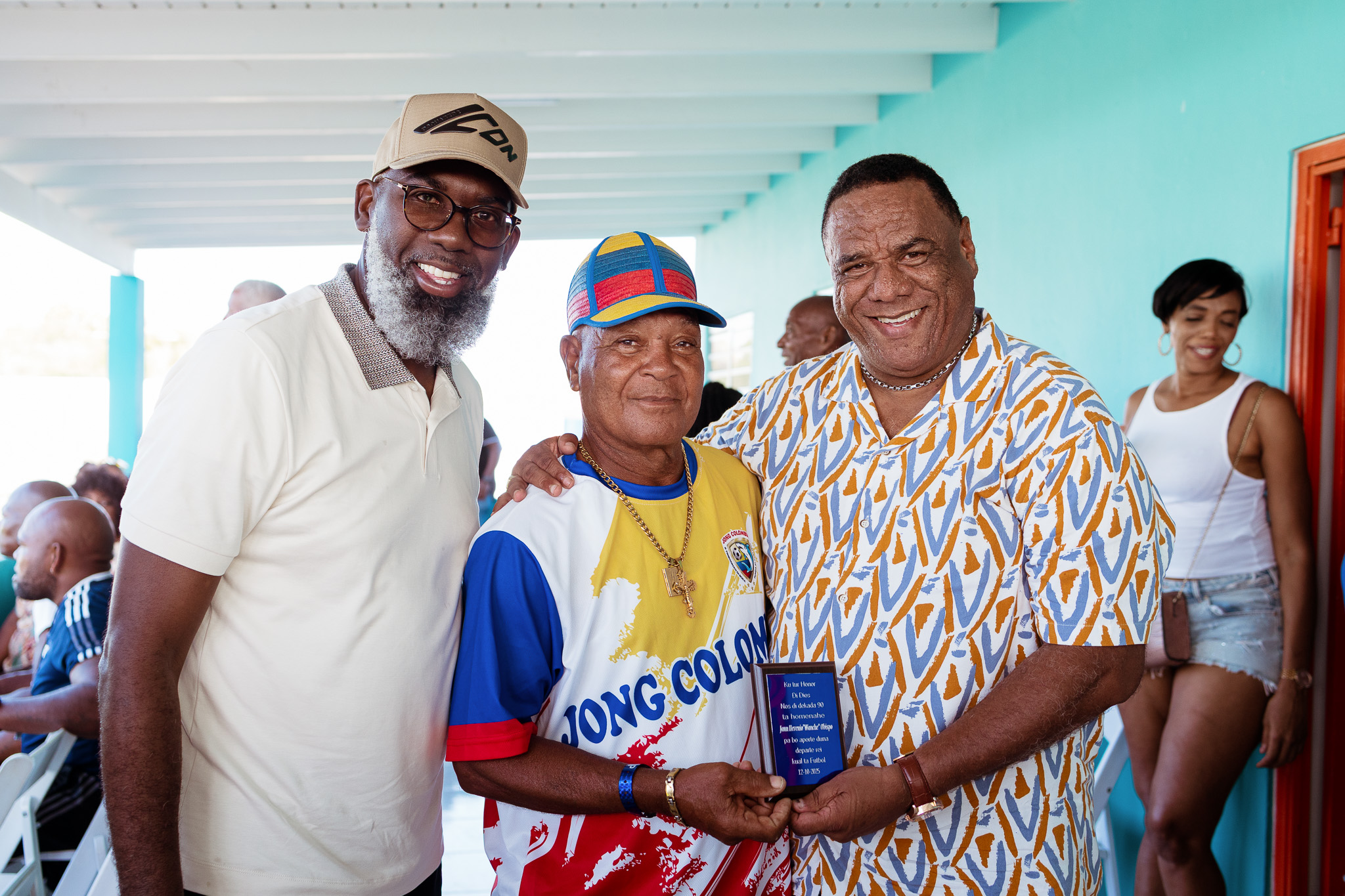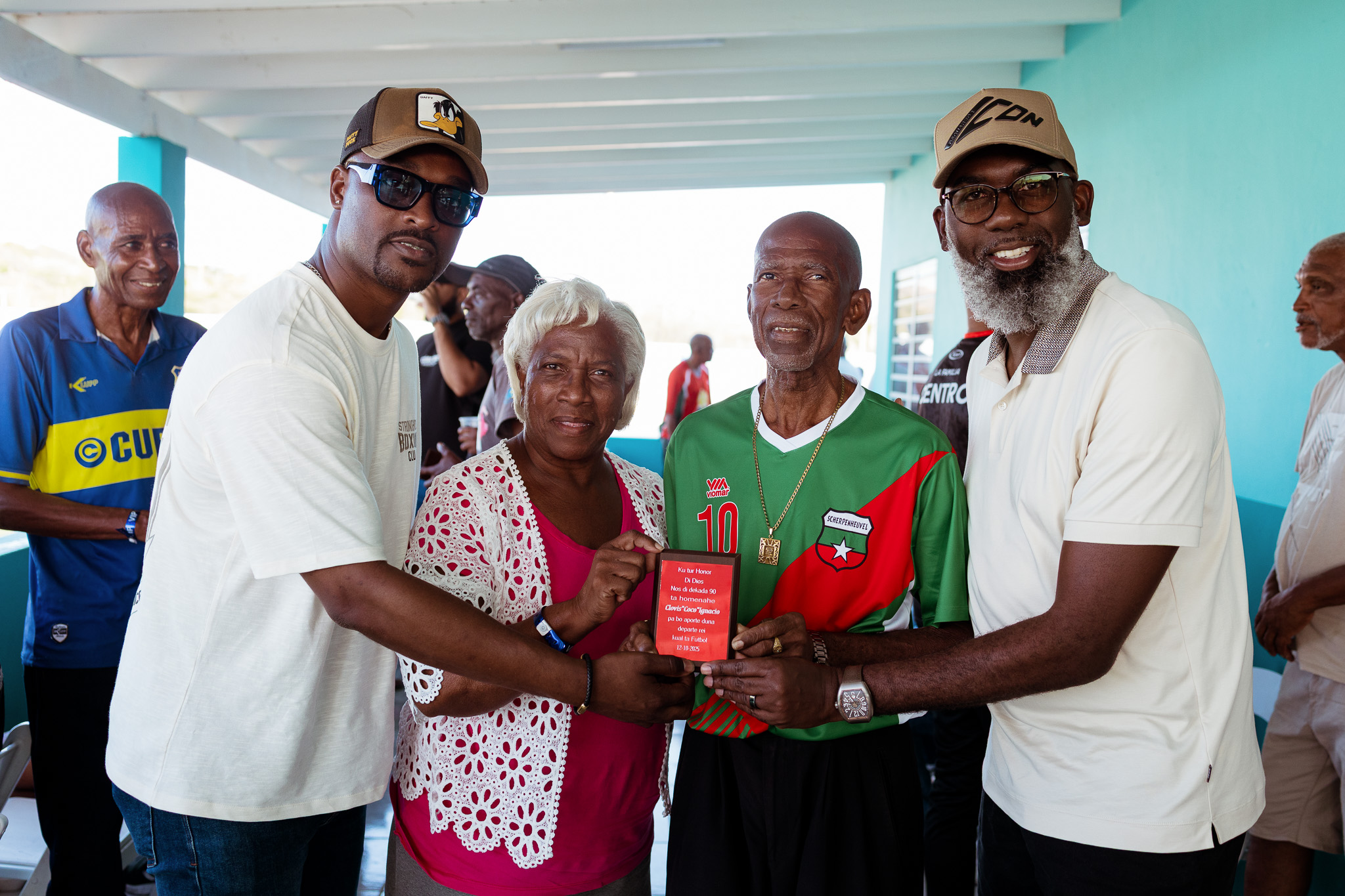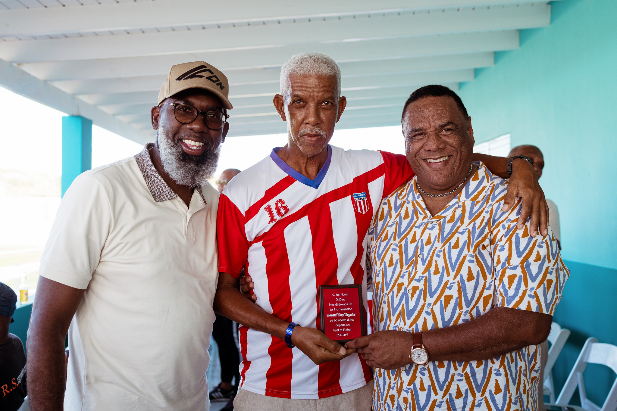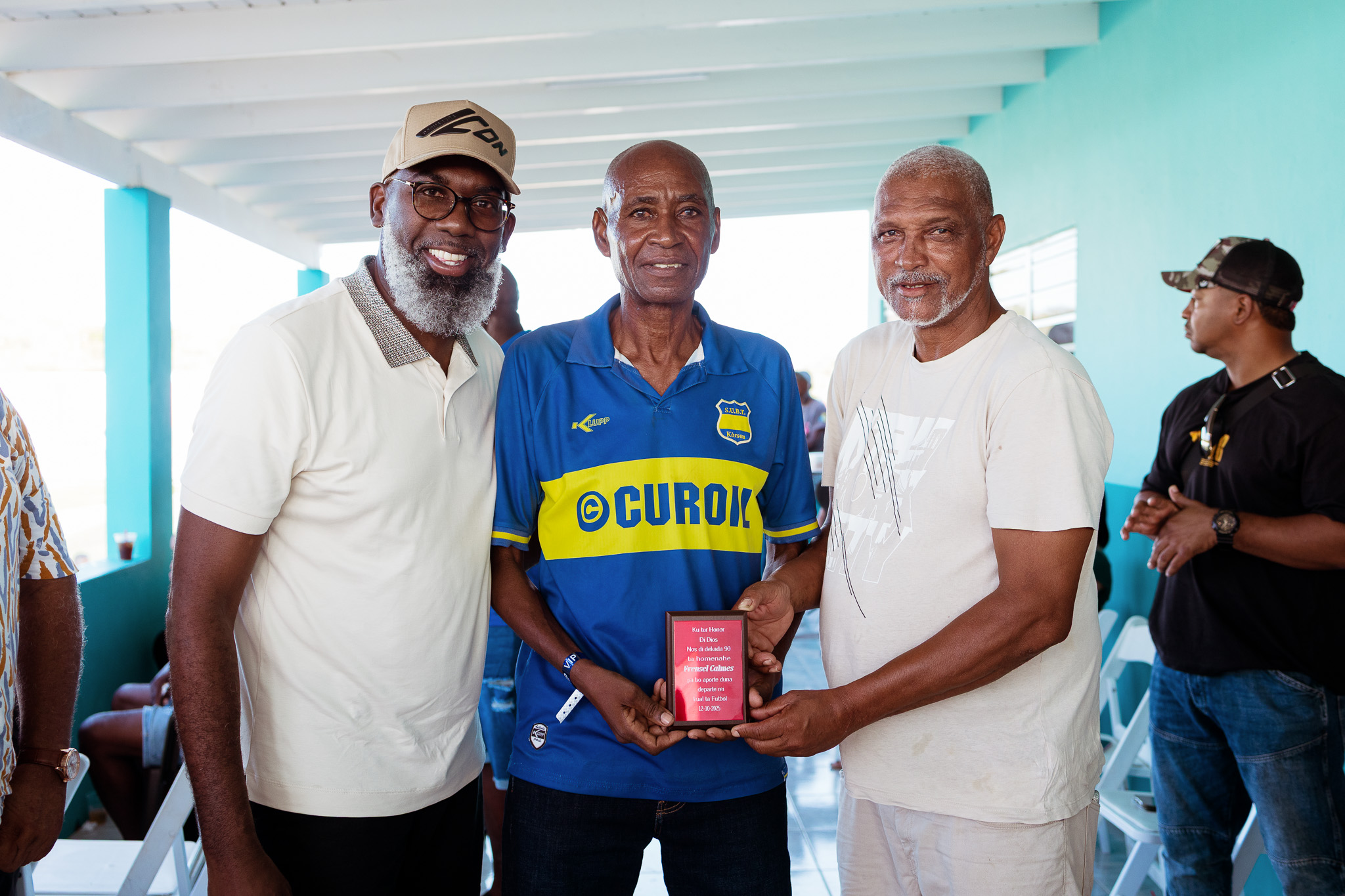 Promé Minister sr. Gilmar Pisas tabata presente durante e okashon pa duna su apresio i rindi un meresido homenahe na esnan ku a kontribuí na e desaroyo di futbòl lokal den añanan nobenta.