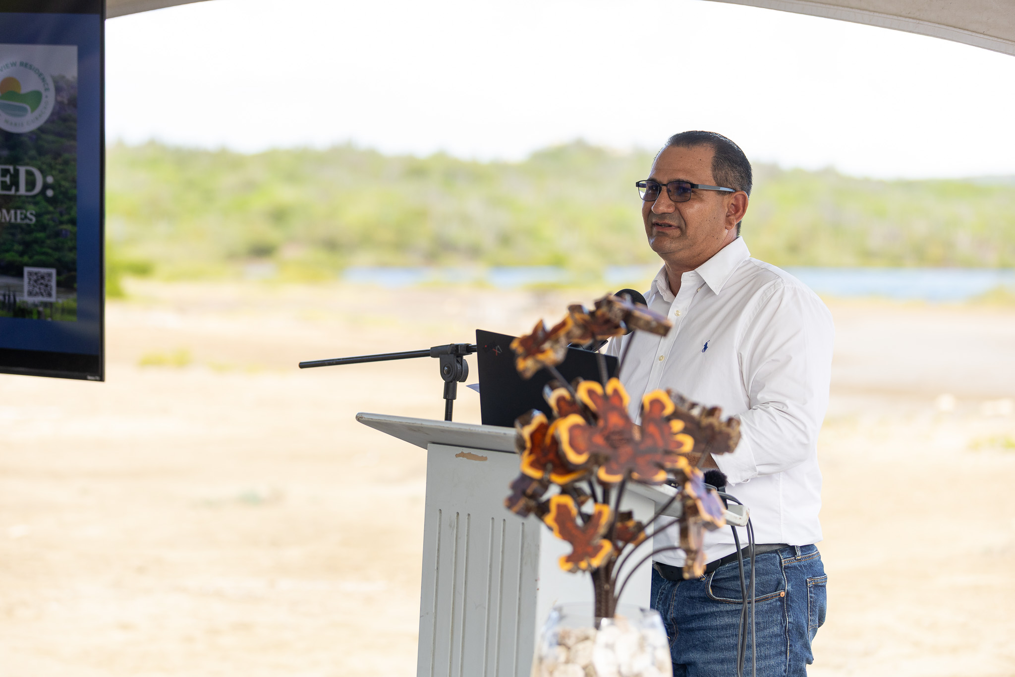WILLEMSTAD, 4 di novèmber 2025 – Promé Minister di Kòrsou, Sr. Gilmar Pisas, a duna un diskurso durante e seremonia di “groundbreaking” di e proyekto Lake View Residence na Rif Sint Marie, realisá pa Janssen de Jong Caribbean i CWM Infrastructure.